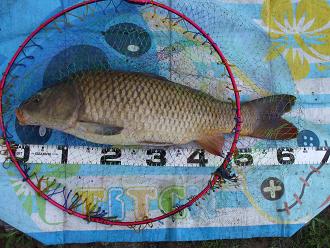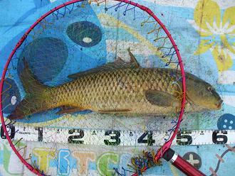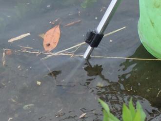 水際に置いてた餌ボールが漂流しかかって慌ててタモ網で回収・・・。