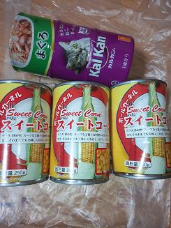 コーンは1つ65円(250g)。猫は3つで237円(1缶160g)でした。